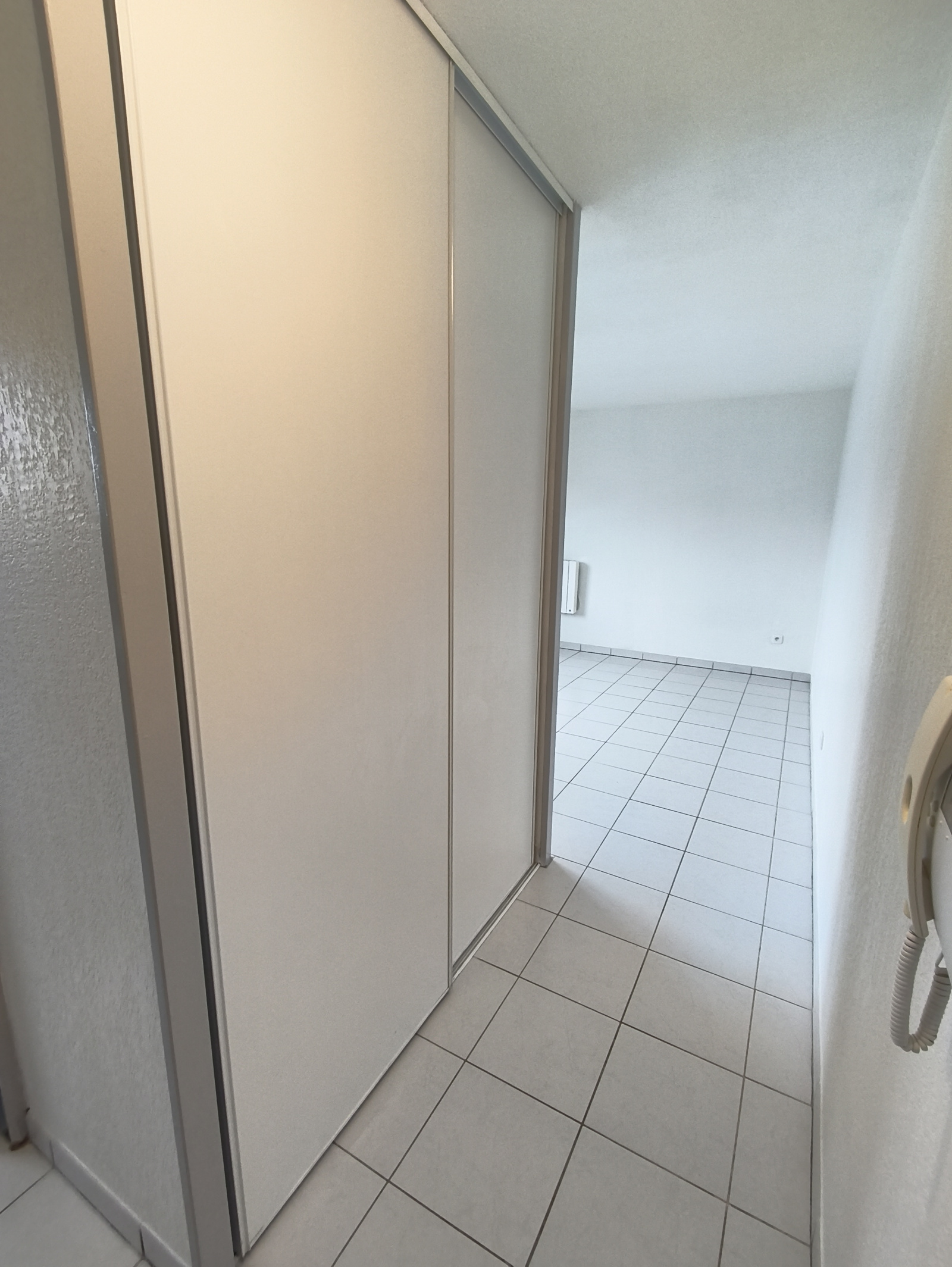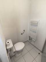 Un appartement dans une petite copropriété en plein centre-ville au 1er étage sans ascenseur comprenant une entrée avec placard, une pièce de vie comprenant une kitchenette (petit réfrIgérateur, plaque de cuisson 2 feux et hotte aspirante) et une salle de bains (baignoire) avec un wc.
